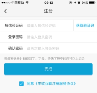 点击【获取验证码】按钮,待收到短信验证码后将其输入,接着设置登录密码并再次确认密码,然后勾选“同意《丰收互联注册服务协议》”,最后点击【完成】按钮,就能完成注册流程。