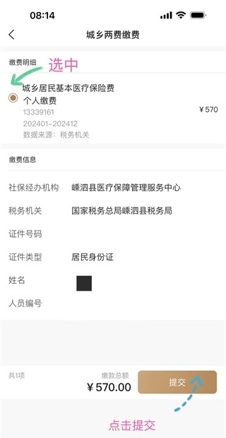 选中个人缴费,点击提交