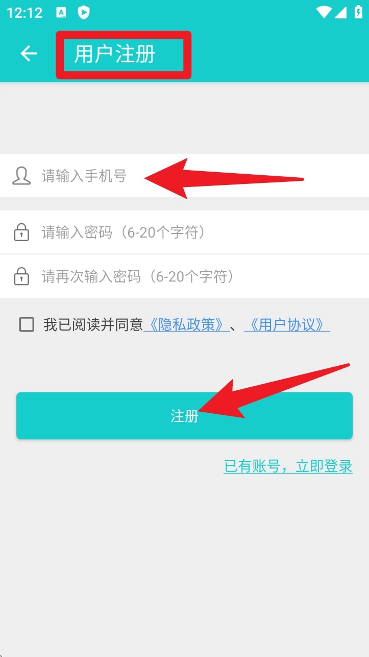 首次使用时,点击“注册”按钮,输入手机号和密码,勾选相关协议后再次点击“注册”,即可完成账号创建。