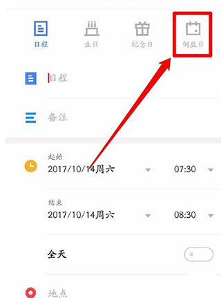 接下来,点击新建日程里的“更多选项”按钮,此时你会看到界面顶部新增了一栏日程类型的选项,在四个项目中选择“倒数日”就可以了。