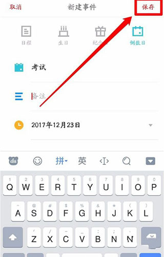 接下来,我们可以填写倒数日的名称、备注和时间,等这些信息都填好后,点击右上角的“保存”按钮,就能完成添加了。