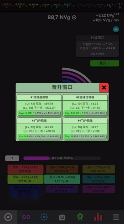 突破无限拿点数:当革命积分达到 1.79×10³⁰⁸这个阈值,就会进入 “无限” 阶段。这时候重置后能拿到无限点数,用这些点数买升级,既能强化收益,还能解锁自动化功能。优先换自动提升、自动买等级的相关升级,后期数值增长太快,手动操作根本跟不上节奏,自动化能省超多事。