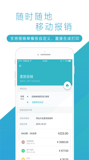 可以在任何时间、任何地点进行移动审批,单据不会再出现积压情况,员工的各项花费能够随时进行查询