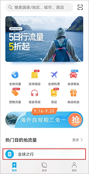 打开天际通应用程序,点击页面顶部的“搜索栏”或者选择“全球流量”选项,搜索你要前往的目的地。