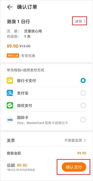 选择对应的套餐后,可点击详情查看具体套餐信息,再完成支付即可。