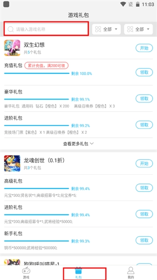 要是在首页没找到合心意的游戏,不妨进入“礼包”页面,通过搜索游戏名称来领取对应的礼包。