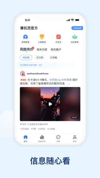 摩托范厂家版是一款专门面向摩托车厂家的运营工具,旨在为用户提供全方位的管理支持。它不仅功能完备,界面还设计得简洁直观,新人也能迅速掌握并熟练操作。平台会第一时间推送相关资讯,用户可以随时通过手机了解市场动态。服务板块划分清晰且专业,涵盖舆情管理、口碑维护、内容宝、品牌摩友圈等多元化服务。通过收集线上反馈,厂家能及时优化运营策略,助力自身发展壮大。有需要的朋友,欢迎立即点击体验!