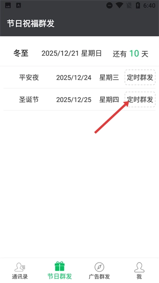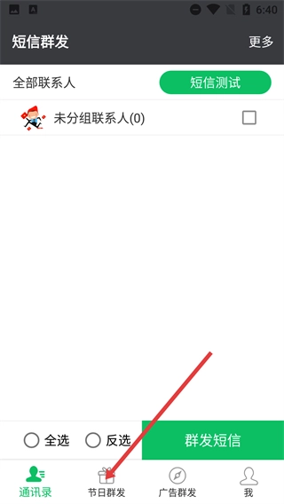 1、在短信群发的通讯录界面,点击底部【节日群发】选项,进入节日祝福群发的专属页面。