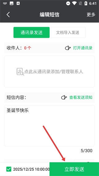 4、确认收件人、短信内容及定时时间后,点击【立即发送】按钮,完成节日祝福的群发操作。