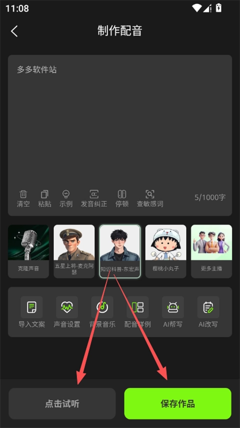4、文字输入好后,就可以根据作品风格选择合适的配音声音,支持切换主播、调整播放效果