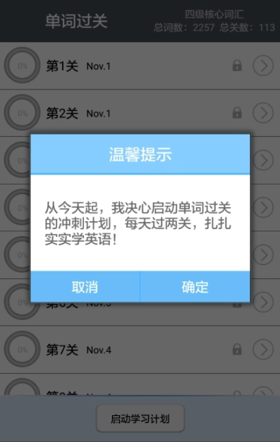 还在为死记硬背英语单词而愁眉不展?还在为担心四级考试不通过而没日没夜地努力,却感觉毫无进展?那就快来试试《金星四级词汇》这款专业的四级英语词汇学习软件吧!它采用闯关式的单词记忆方法,不仅能让你对单词的印象更深刻,而且形式灵活不死板,让学习过程充满趣味性!感兴趣的小伙伴们,赶紧行动起来吧!