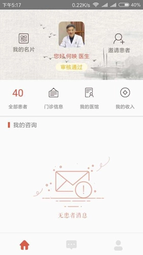 设置完成后,你就能开启自己的医馆了。医馆首页会展示患者发送的消息,医生还能添加线下门诊信息,管理医馆的收入情况。