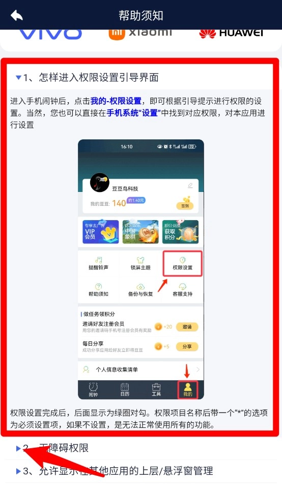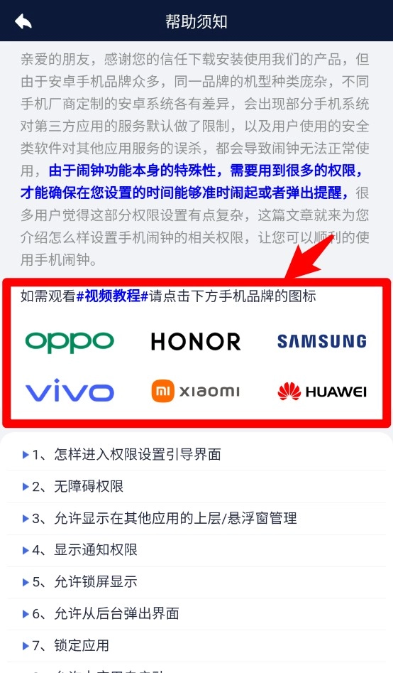 点击品牌图标即可跳转查看针对OPPO、VIVO、HONOR等不同手机型号的权限视频教学及设置说明。