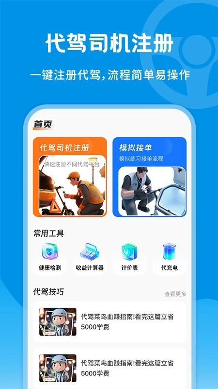 代驾司机版是一款专为代驾司机打造的一站式接单辅助工具,能帮助司机快速完成代驾注册流程。软件模拟接单功能,通过实操练习让司机熟悉接单全流程,助力新手快速掌握接单技巧;同时还整合了丰富的代驾经验分享,司机可随时学习各类实用技巧,从新手成长为代驾熟手。此外,软件提供收益计算器、计价表、代充电、健康检测等常用工具,满足日常工作需求,精准计算代驾收益,让司机直观了解每日接单收入情况。有需要的用户欢迎下载使用代驾司机版手机应用!