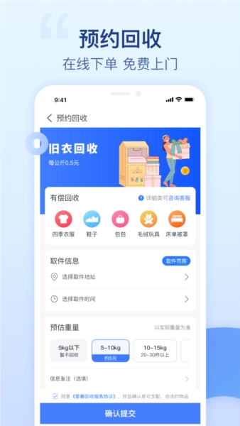 爱裹旧衣服回收推出旧衣回收服务,用户可通过线上提交回收申请,并预约上门取件服务。