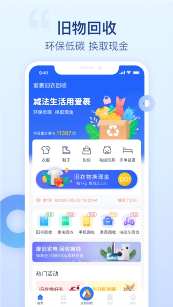 旧家电回收服务:您可在线预约旧家电估价,专业师傅将免费上门进行评估,评估后您能获得环保金,该环保金无使用门槛且支持极速提现。