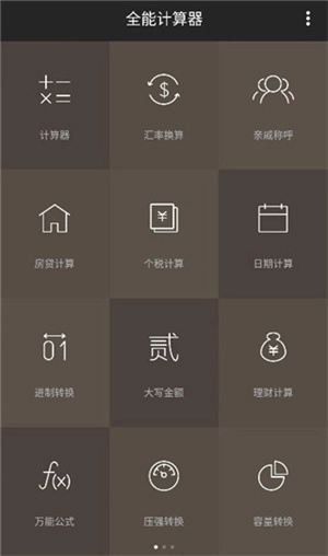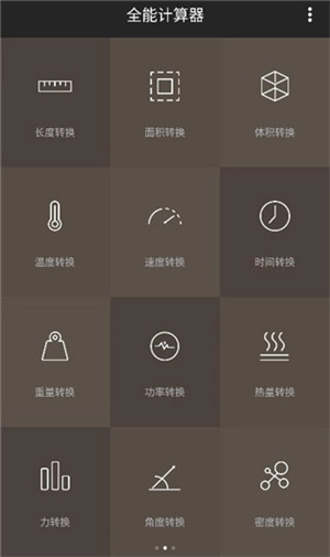 大家安装进入后会发现,这款计算器具备三页功能界面,用户能在这里找到各类可供计算的“单位”选项。