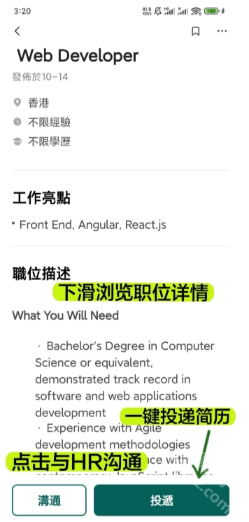 5. 向下滑动即可查看职位详情,还能一键投递简历并与HR沟通
