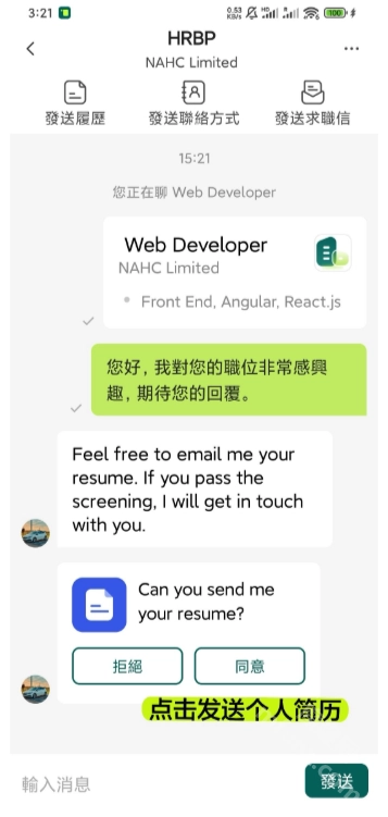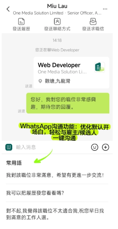 2、具备“一键申请”和“即时聊天”功能,求职者能直接和HR在线交流,从而压缩招聘流程。