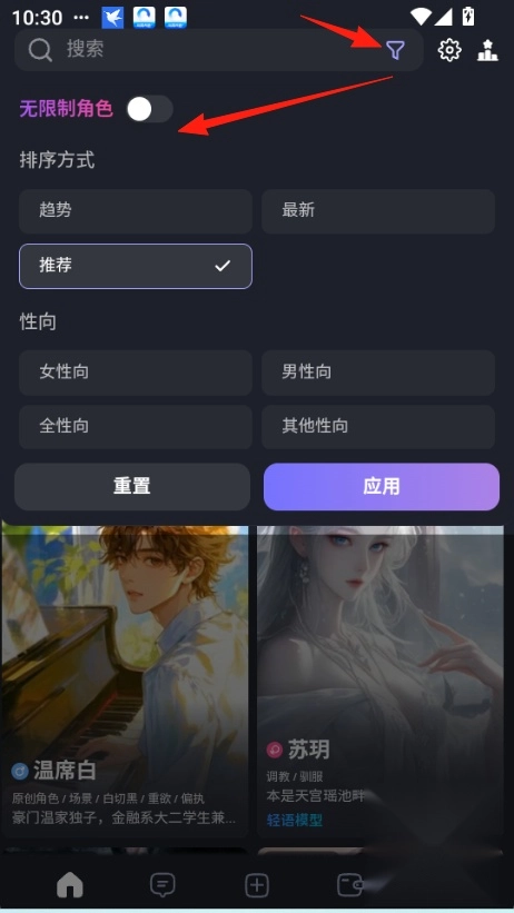 2. 也可以点击搜索框右侧的漏斗图标,进行排序方式、性向排名的设置,或者开启无限制角色功能。