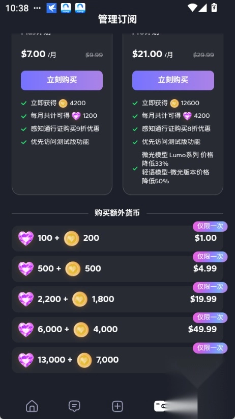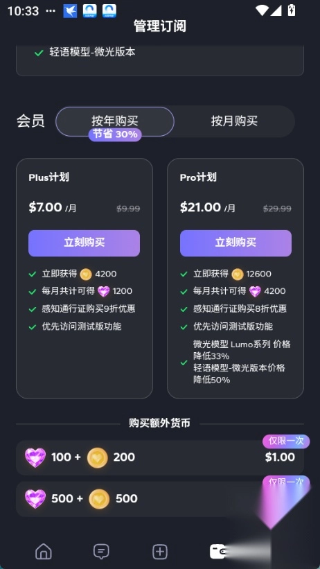 2. 进入订阅页面后,挑选你想要充值的会员类型或对应的货币,然后点击“立即购买”按钮就可以了。