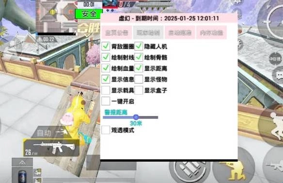 虚幻直装是专为和平精英玩家推出的免卡密稳定版游戏辅助,可以自由设置警报距离和开启观透模式,在绘制功能这块玩家也是可以自由一键开启背敌圈圈、隐藏人机、绘制射线、绘制骨路、绘制血量、显示距离、显示信息、显示怪物、显示载具、显示盒子等功能,爱玩和平精英的玩家值得体验体验。