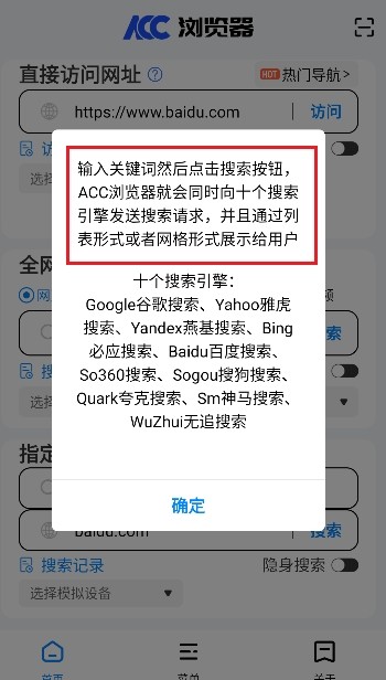 ACC浏览器是一款非常好用的浏览器软件,软件中有着非常该方法的内容可以进行使用同样的软件中操作也非常的简单,软件可以帮助用户快速获得需要的资源并且软件中操作也很简单,软件中有着汇总了大量的搜索引擎用户可以自由的进行切换非常的便捷,软件中还有非常安全的隐私功能用户可以更好的进行搜索并且软件中用户可以收藏喜欢的网页方便下次进行使用非常的方便。