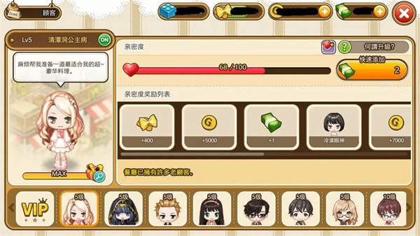 有一类特殊的老顾客,他们没有等级划分,且VIP顾客的数量相当多。每天系统会随机安排一位VIP顾客出现,当与该顾客的好感度达到满值后,就能参与抽奖活动。值得注意的是,每位VIP顾客对应的抽奖池都各不相同,其中主要的奖品就是他们所穿着的衣服。如果想快速获取心仪VIP顾客的衣服,还可以使用积木来刷新VIP顾客。另外,这些VIP顾客只能接受由料理学院制作的料理(关于料理学院的具体情况,下文会进行详细说明)。