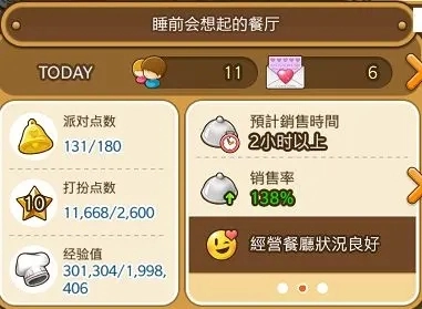 就是卖餐速度,销售率越高,你做的餐就卖的越快,销售率取决于你厨具的加速值和餐厅桌椅的摆放数,目前最好的厨具是加速25%销售速度,那么,桌椅到底摆放多少才合适呢?等级不同,需求的桌椅数也不同,可以看销售率下方的笑脸,如果桌椅摆放到显示“餐厅经营状况良好”,就说明桌椅需求已经满足了,再摆放也不会增加销售率了,已经当前等级最高了。
