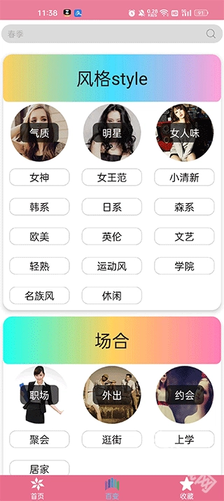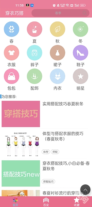 首先安装并打开软件后,首页会呈现各类穿搭资讯,内容涵盖春夏秋冬四个季节,同时也包含了多种不同的穿搭种类。
