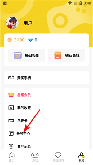 在主页下方有三个板块,分别是游戏、砖石商城、我的,点击进入到我的页面;