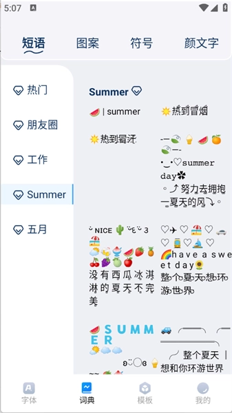 在【词典】页面,能浏览朋友圈动态、职场文案、夏季主题文案等各类文案,方便随时取用。