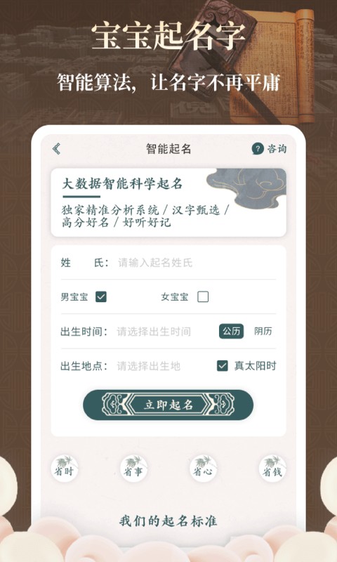 仅需输入姓氏等基础信息,即可快速生成名字,定制专属于你的优质好名。