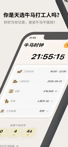 牛马时钟是一款专为打工人打造的高精度工资计算工具,能帮我们实时记录工作时长,精确程度甚至到每秒。它会依据我们的薪资标准,算出每一秒对应的收入,还能让我们清楚看到每天、每月乃至全年的收入情况!这款工具支持多种工作制度,像双休、单休、大小周都能适配,节假日也会被智能识别,特别贴心!而且它的界面设计很简洁,各项数据展示得清晰直观,让每一秒的工作时间都能“看得见价值”,非常值得大家试试!