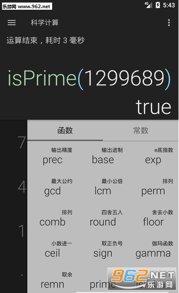 目前已有的函数包括:平方根、立方根、开方、随机复数、随机整数、常用对数、自然对数、对数、绝对值、最小、最大、阶乘、正弦、余弦、正切、反正弦、反余弦、反正切、双曲正弦、双曲余弦、双曲正切、反双曲正弦、反双曲余弦、反双曲正切、倒数、累加求和、实部、虚部、辐角、模长、寄存、共轭复数、导函数、极限、求值、函数零点、定积分、e底指数、最大公约、最小公倍、排列、组合、四舍五入、向下取整、向上取整、取正负号、伽玛函数、取余、分数化简、质数、判断质数、判断奇数、转角度、转弧度、重启、输出精度、输出进制、排列方式、字体大小、自定义。