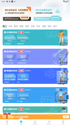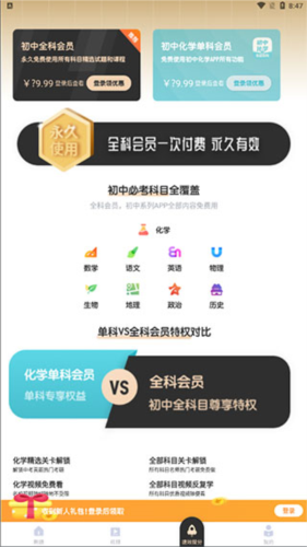 在速效提分栏目页面,平台设置了两种会员服务模式,分别是初中全科会员和初中化学单科会员。