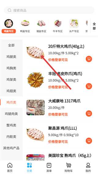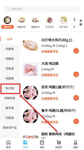2、在分类页面中选择【鸡爪类】分类选项,进入该分类对应的商品列表页面,查看相关食材商品信息。