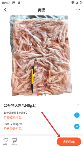 3、在【鸡爪类】商品列表里,点击【20斤特大鸡爪(40g上)】商品条目,进入该商品的详情展示页面。