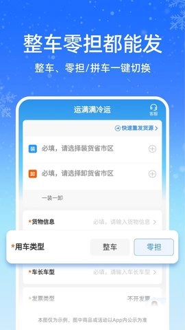 运满满冷运是一款专注于冷链运输服务的货运物流软件。其核心优势在于服务优质且专业性强,不仅能精准规划货运路线,还可实时追踪运输动态。运输全程采用温控技术,确保冷链运输的高品质标准。选择运满满冷运,您将体验到货源选择丰富、车型种类齐全的便利,享受到快速找车、高效运输的便捷,同时还能获得经济实惠、省心省力的服务。无论您运输的是农产品还是其他冷链货物,运满满冷运都能满足您的需求,让发货变得轻松简单。