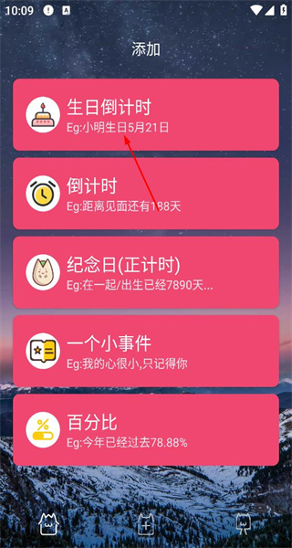 2、进入添加页面后,浏览各类计时类型,找到并点击生日倒计时选项,即可进入新建生日计时的页面。