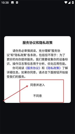 打开软件后,会弹出【服务协议和隐私政策】的弹窗,点击【同意并进入】按钮即可进入软件的主界面。