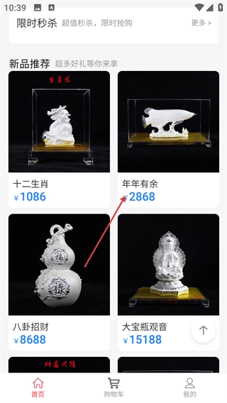 2、在软件首页的【新品推荐】区域,挑选想要的商品(例如【年年有余】),点击该商品即可进入商品详情页。