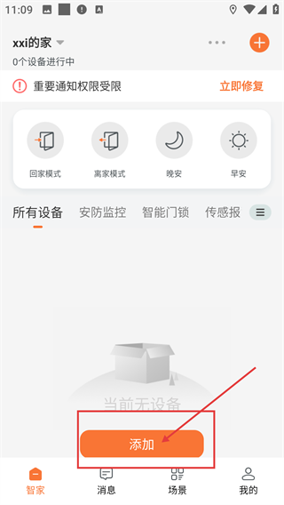 1、进入智家页面后,若当前无设备,点击【添加】按钮,可进入设备添加界面,开始绑定智能设备。