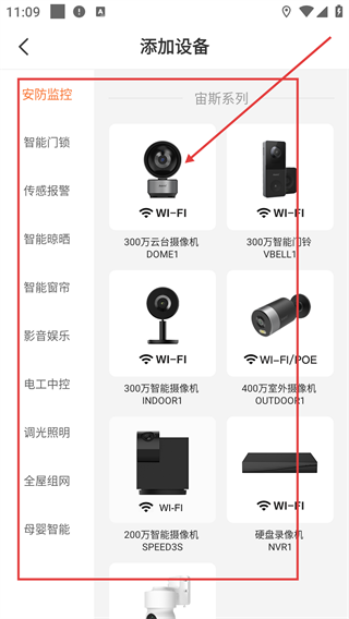 2、在添加设备页面,选择对应设备分类(如【安防监控】),点击目标设备(如【300万云台摄像机-DOME1】)进入配置流程。