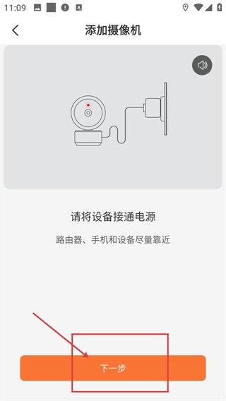 3、进入添加摄像机页面,按提示接通设备电源后,点击【下一步】按钮,继续设备配置流程。