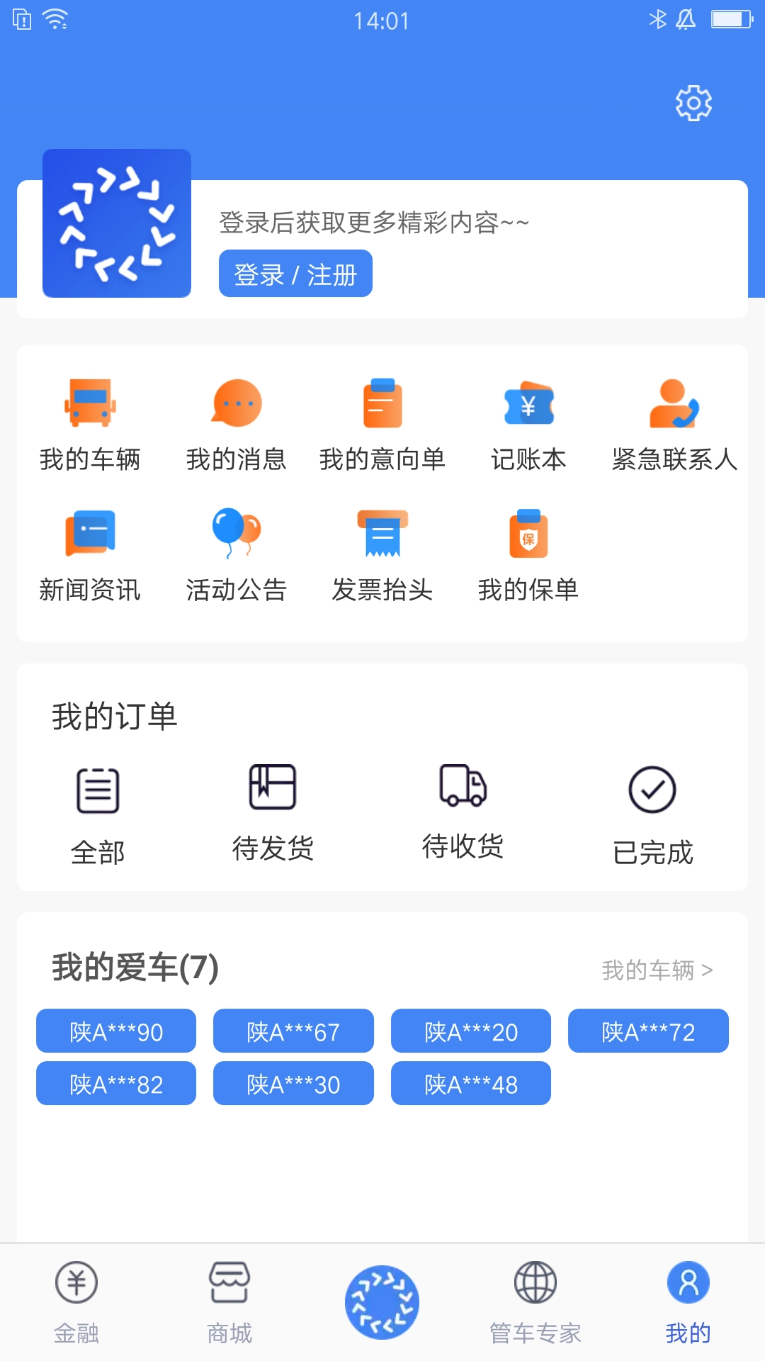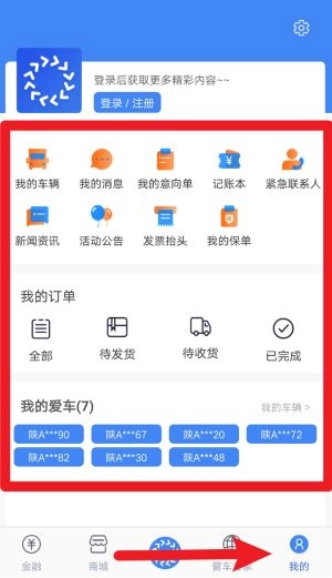 4、点击我的菜单可进入个人中心,查看我的订单、车辆、保单及发票抬头等重要个人信息与服务入口。