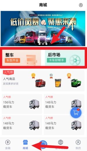 2、在商城板块中可浏览整车及后市场产品,通过分类快速查找卡车配件及热门商品。