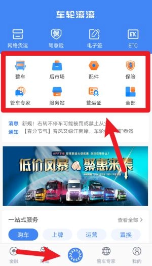 3、点击车轮滚滚模块后可访问整车、保险、配件、管车专家等多个功能入口,支持卡车全生命周期服务。