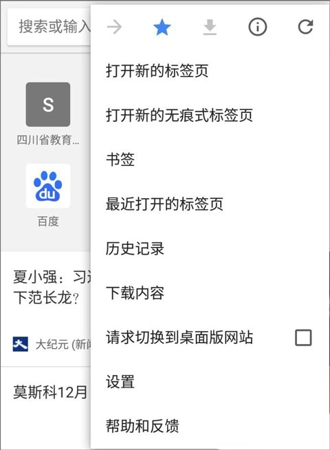 5、点击右上角的三个点,还能进行切换到桌面版网页、打开新标签页等设置操作。