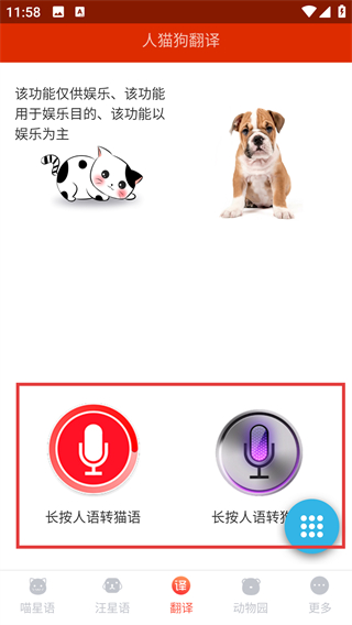 2、点击底部【翻译】选项,进入人猫狗翻译页面,可使用【长按人语转猫语】等功能实现趣味语言转换。
